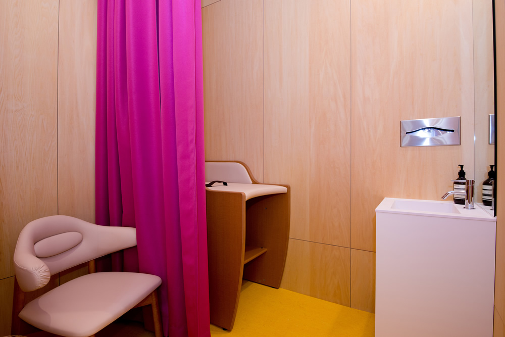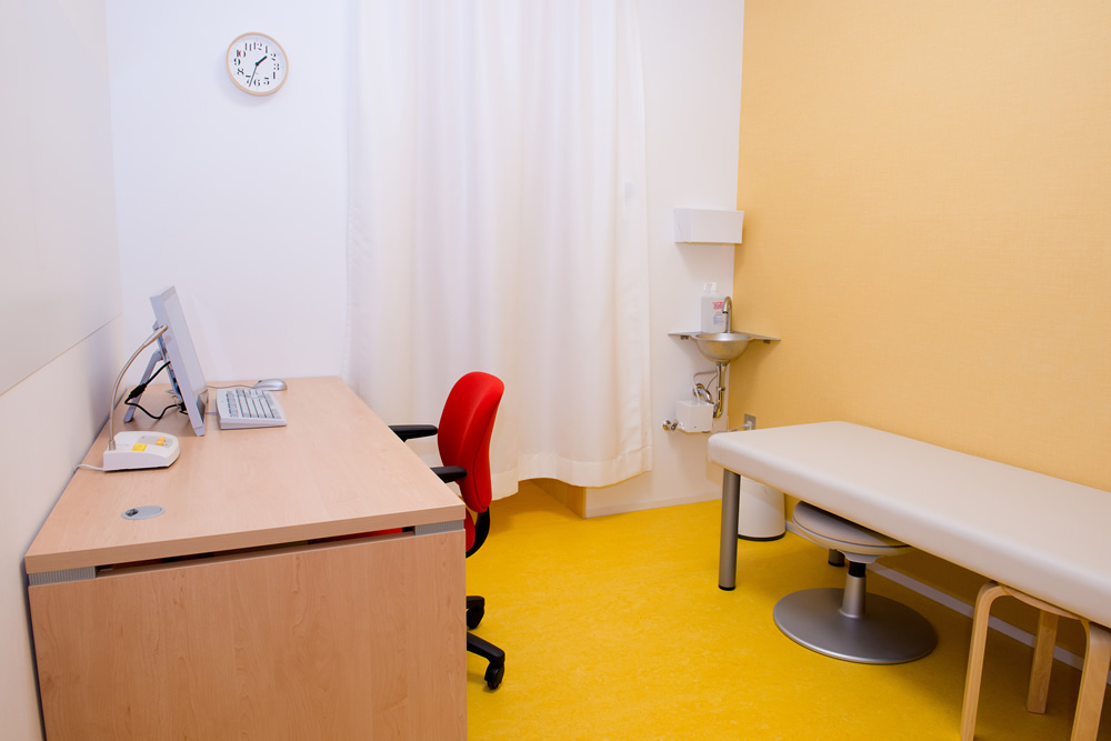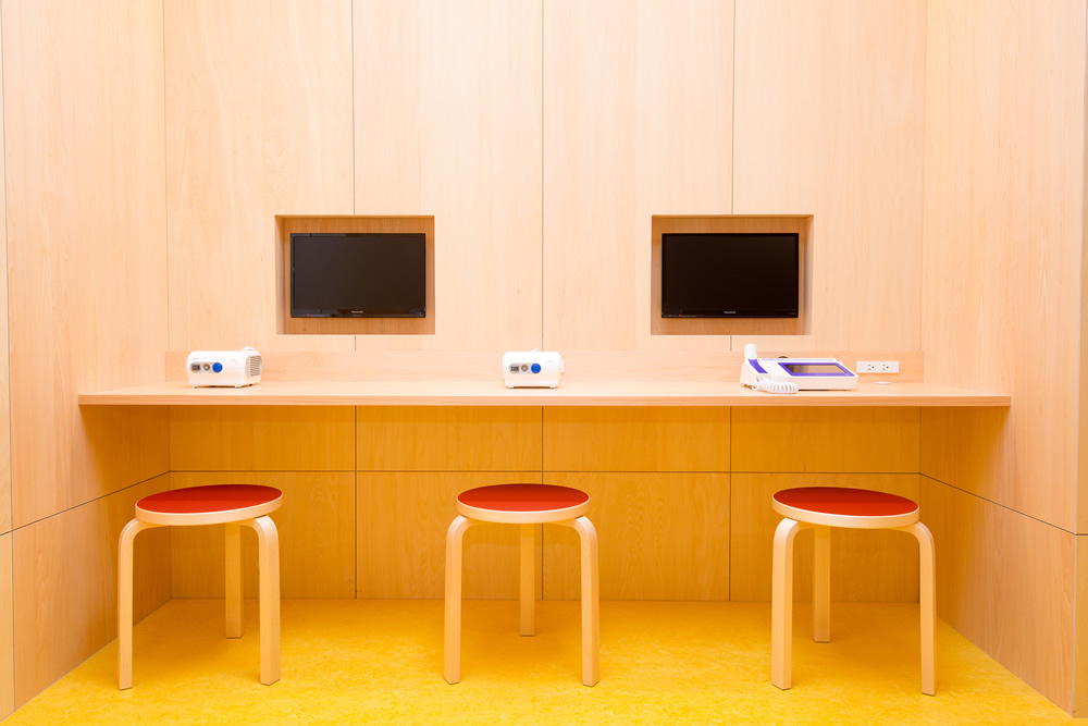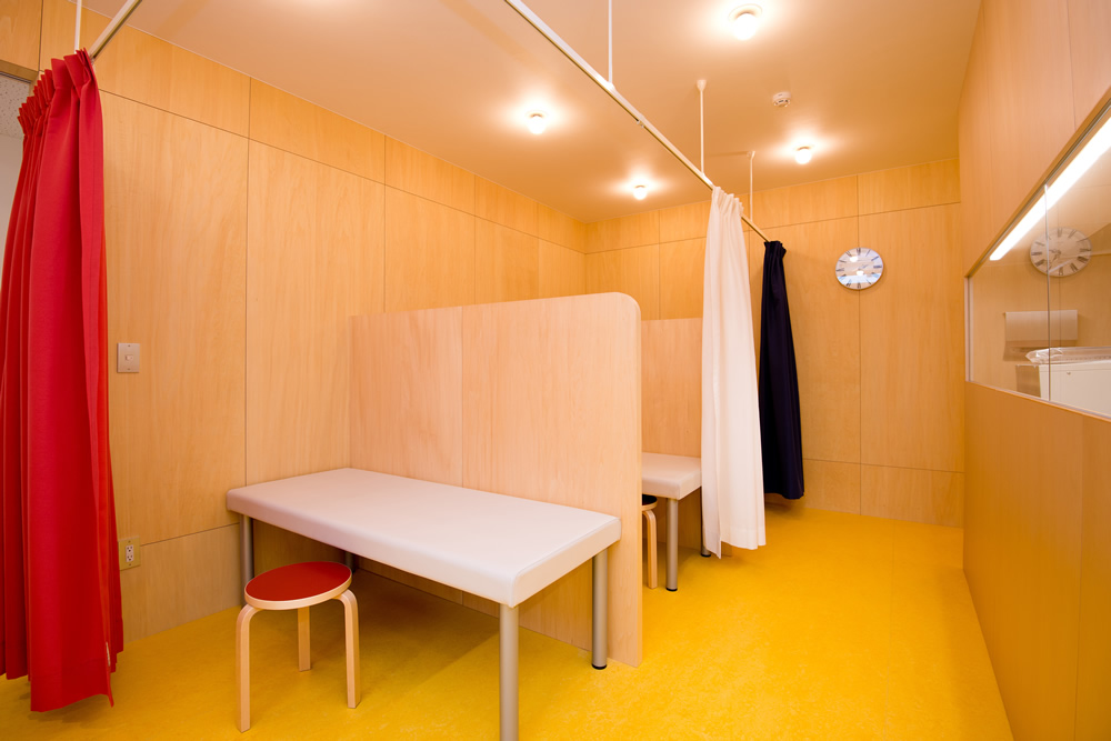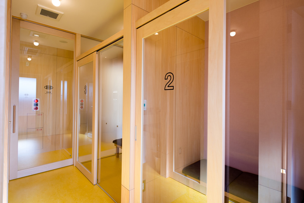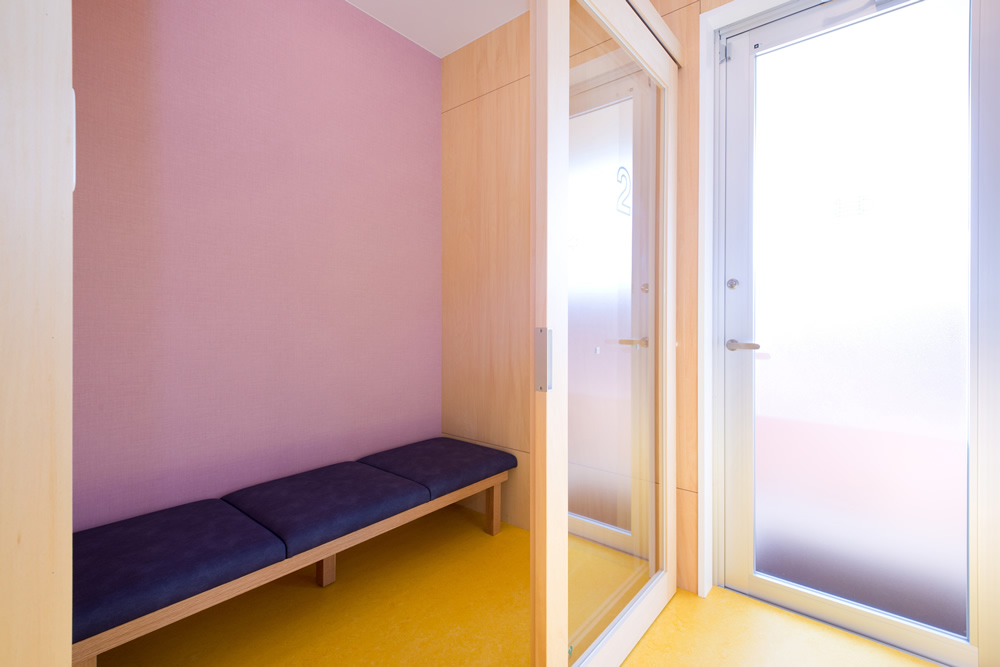 院内は全てバリアフリーで、待合室は子供たちが快適に過ごすことができるよう、木漏れ日の中の温かさをイメージし、床暖房を完備しました。また院内感染を防止するため出入口が別になった感染室を3部屋設置しています。個室の授乳室やおむつ交換台もあり乳児をもつ母親にもやさしい構造です。駐車スペースも大きく確保し17台の駐車が可能で、ストレスなく駐車することができます。